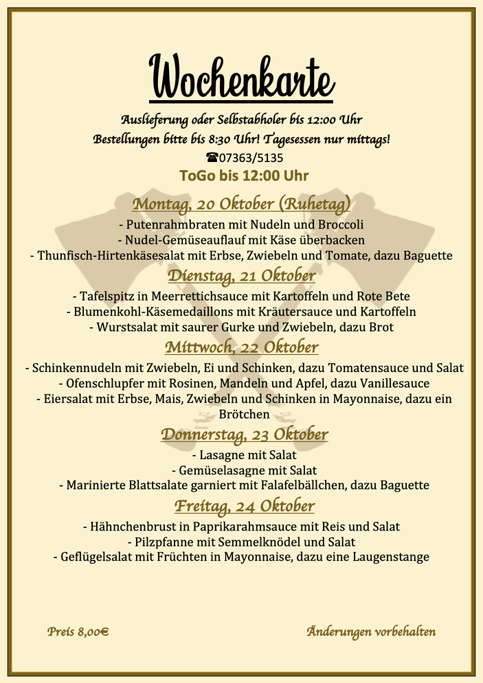 Gerne können Sie das Gericht Ihrer Wahl auch bis 08.30 Uhr vorbestellen und bis 12 Uhr abholen oder sich von uns liefern lassen. Rufen Sie uns einfach an: